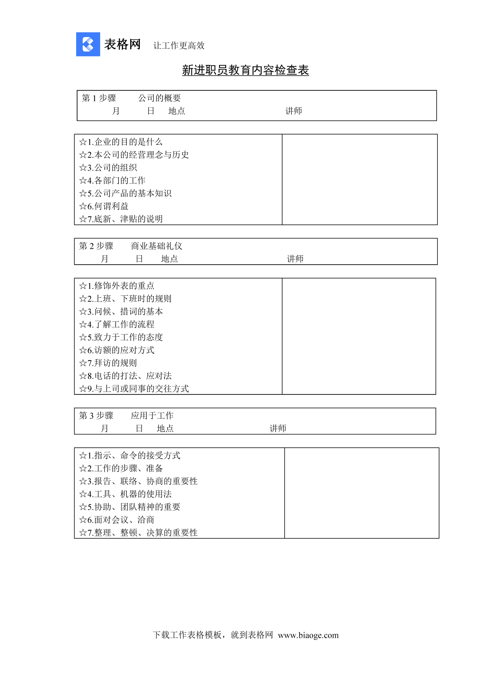 新进职员教育内容检查表