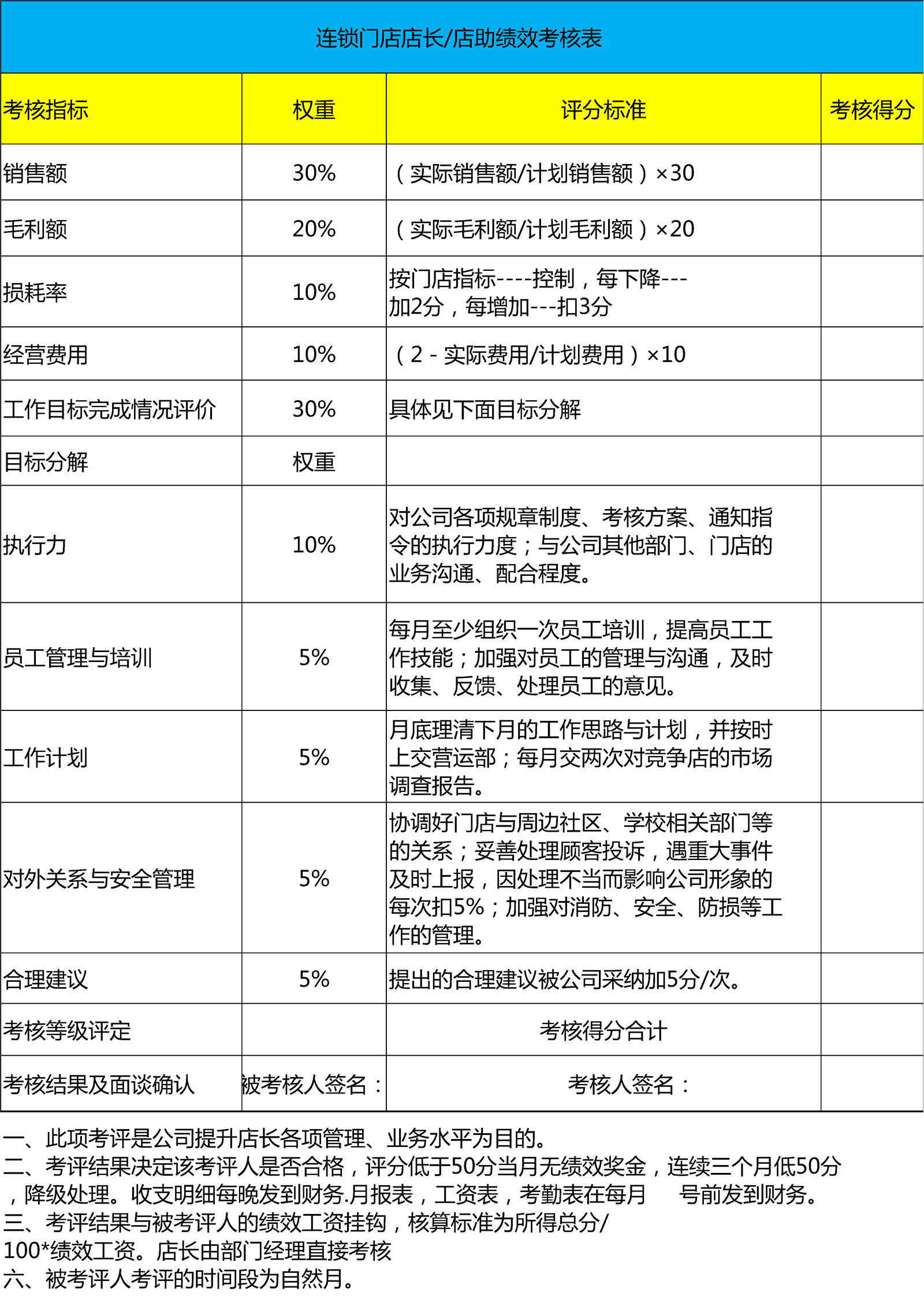门店店长绩效考核表