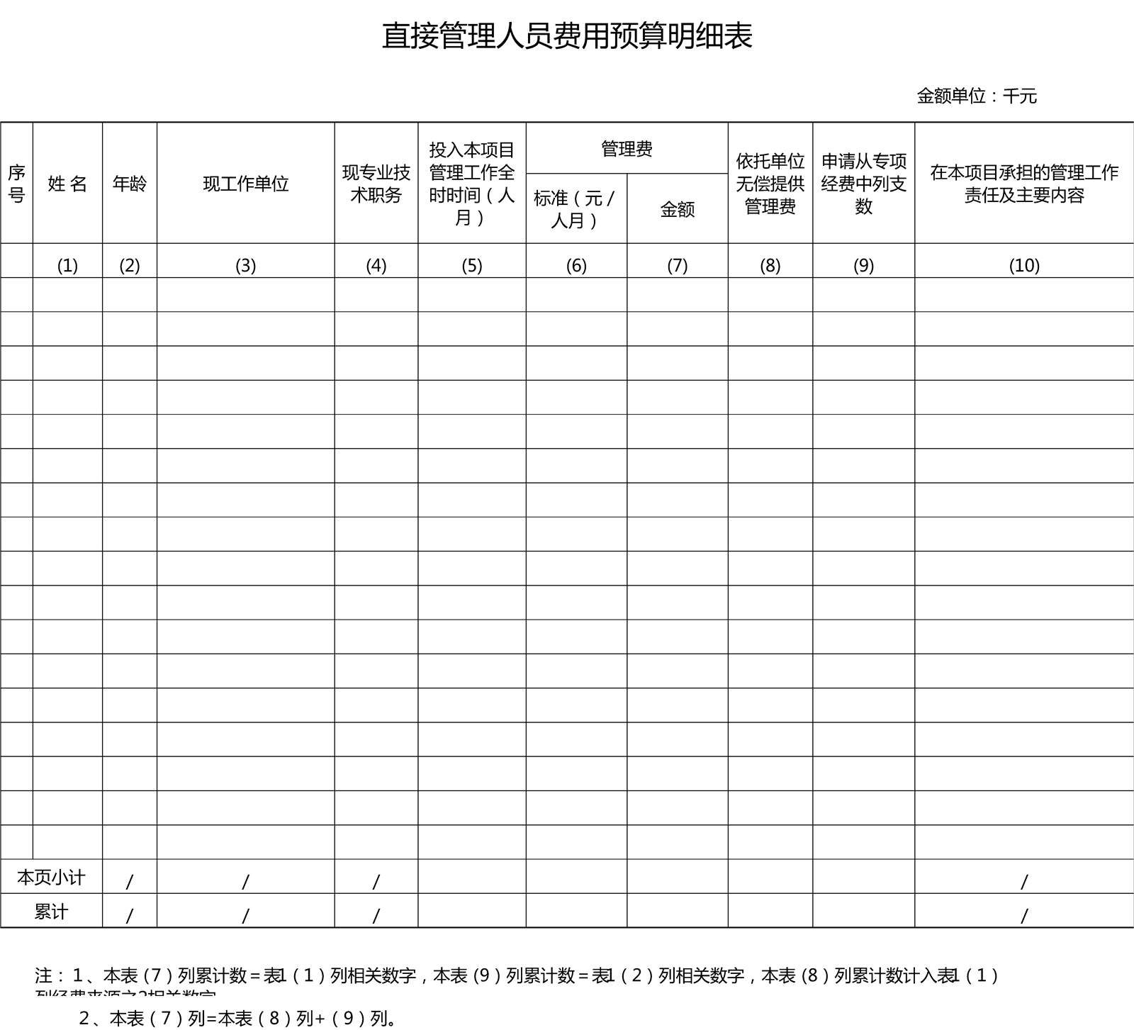 直接管理人员费用预算明细表