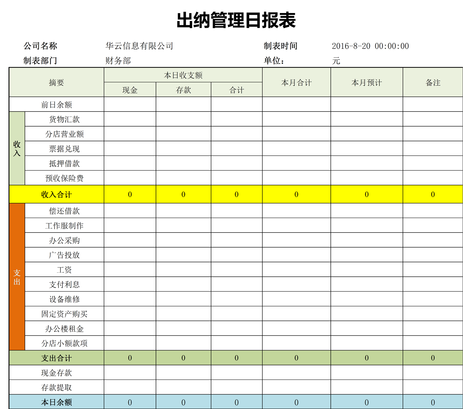 出纳管理日报表