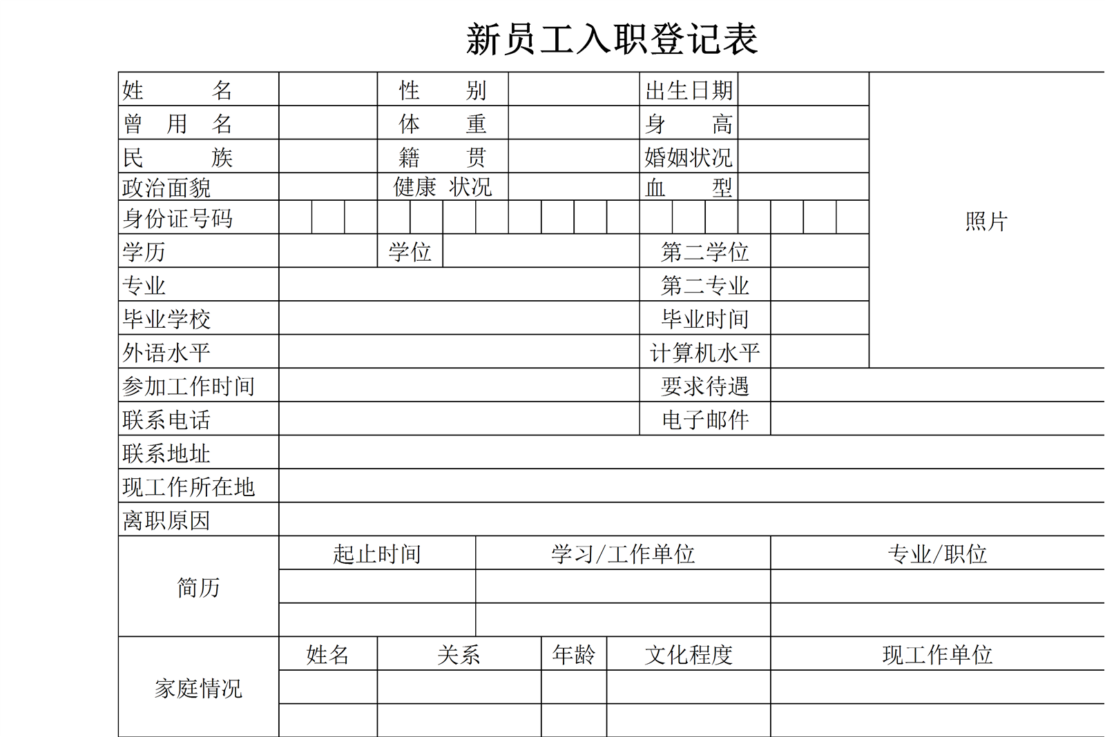 新员工入职登记表