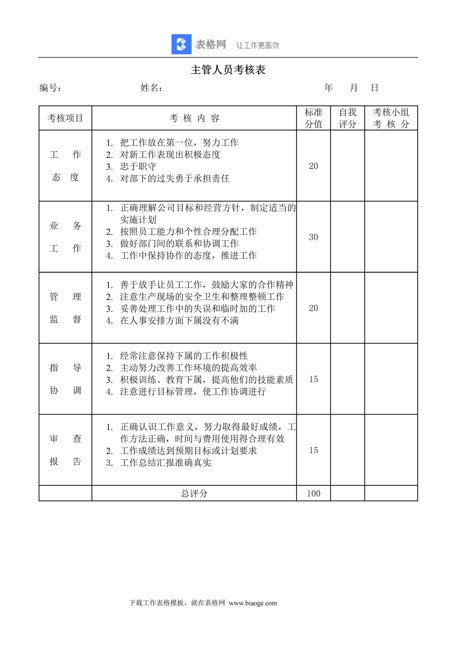 主管人员考核表