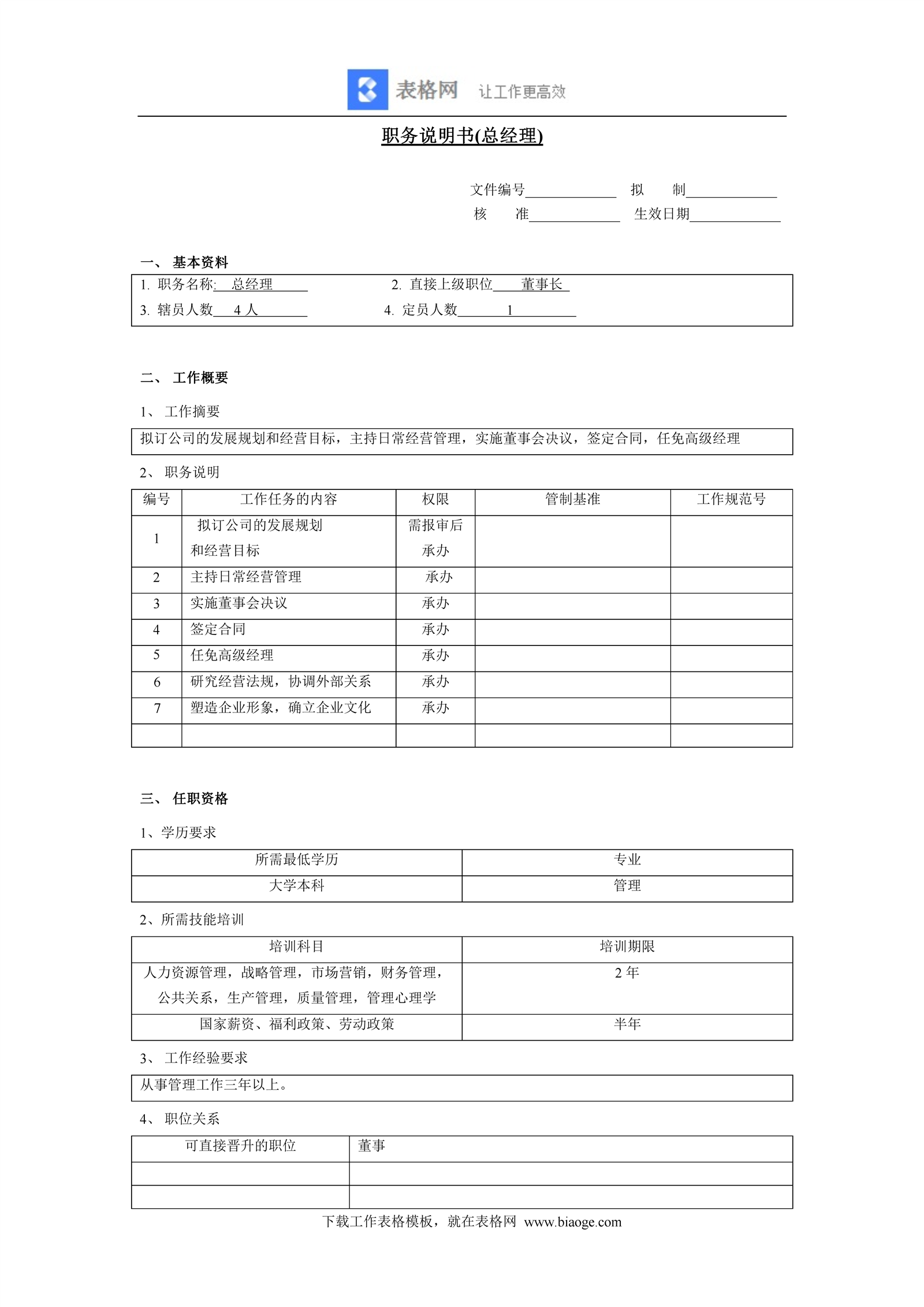 文档介绍:职务说明书(总经理)
