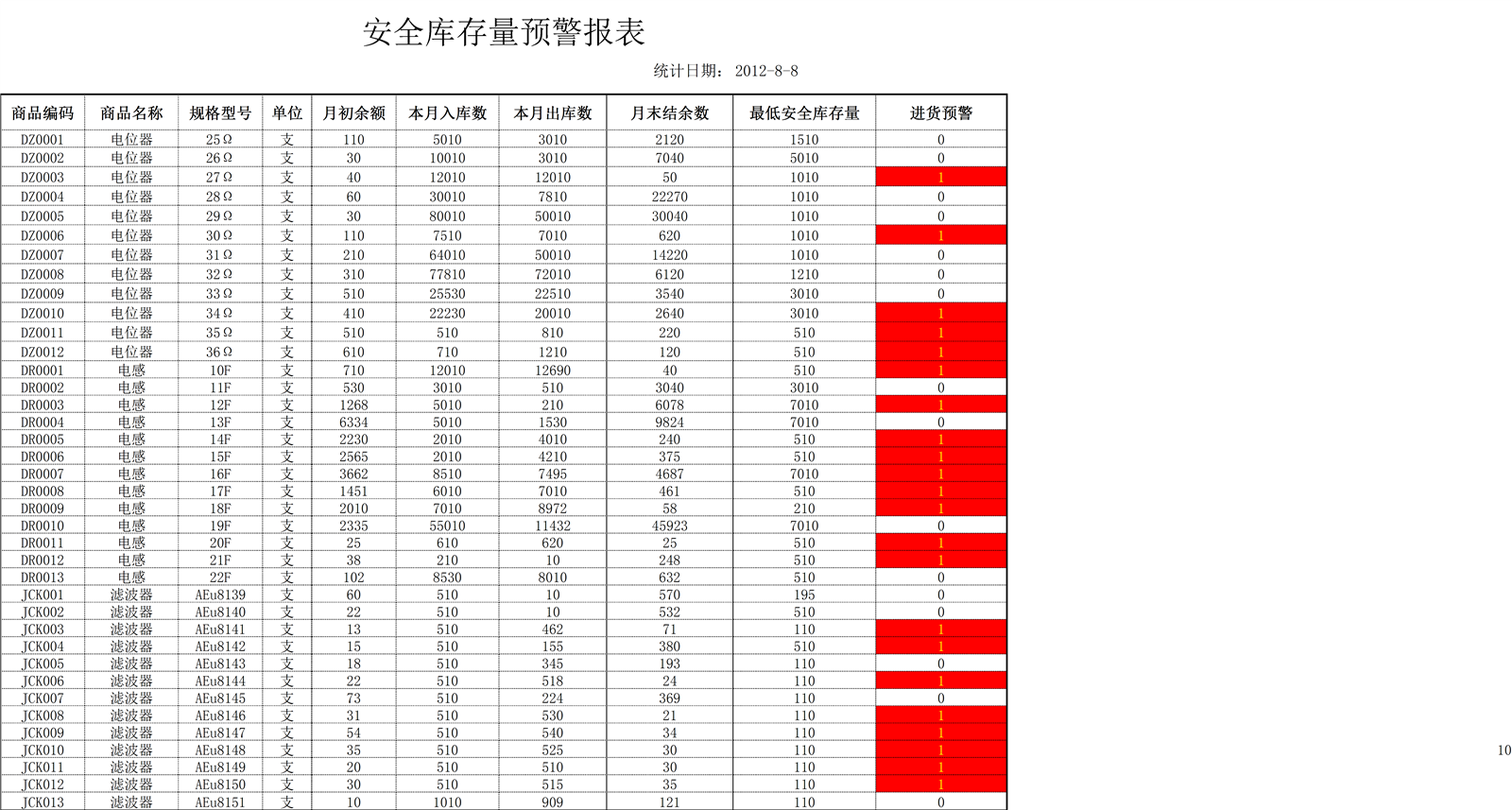 安全库存量预警报表