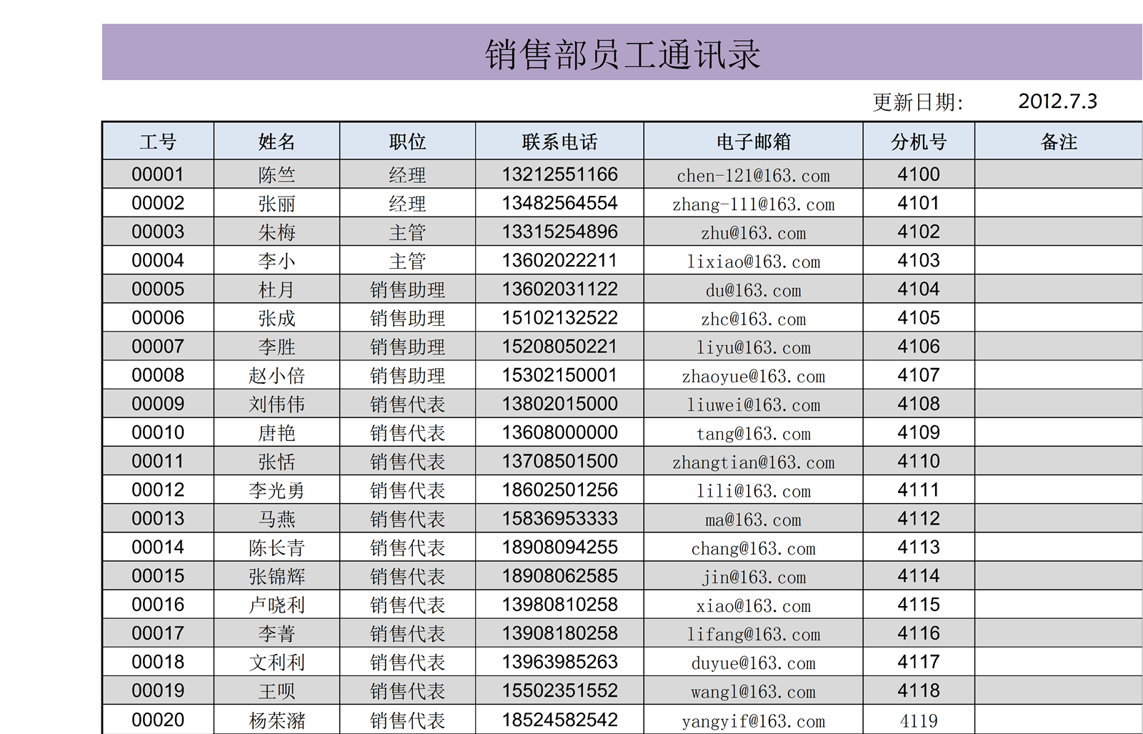 销售部员工通讯录